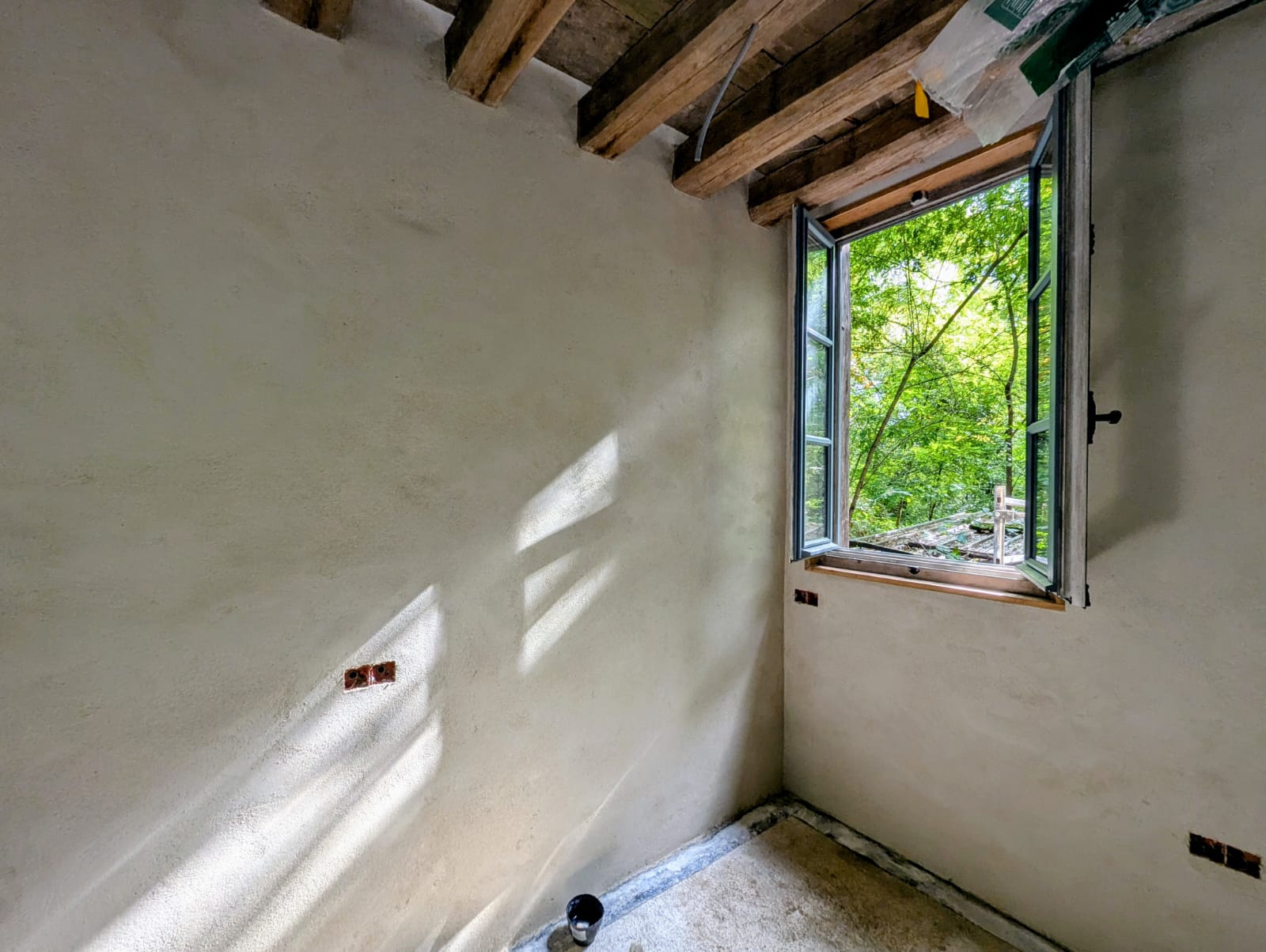 Enduit chaux aérienne sur murs - Plâtrage et badigeon sur voûtes - Eau-forte sur chaux-chanvre banché .